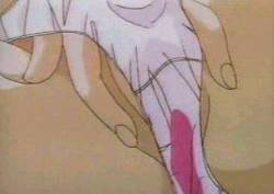 So, she masturbates, and it’s nice, and then she does the “Miyu, you know that I’ll SAVE you, I’M COMING” thing, which is ingenious, and then her mouth and voice completely lose sync during the last part, which is surreal and lends credence to the "Miko's diseased brain" theory. Then she and NinNin fall through what appears to be a piece of geometric art, and Miko arrives in the demon world still in the middle of her orgasm and clutching at her boobies. Also, she lands on NinNin, and any pain that the midget feels is a good thing in my book. Miko’s first reaction to the unholy organic construction of the Shikima realm? “Oh man! I JUST can’t BELIEVE how really CREEPY this place is! I FEEL like I just fell into a BAD HORROR movie!” which sounds so much funnier when she has nothing on but a limp piece of fabric rolled up over her breasts. Also, if she’d replaced “horror” with “hentai” and “fell into” with “starred in,” she’d be right. God I hate her.
