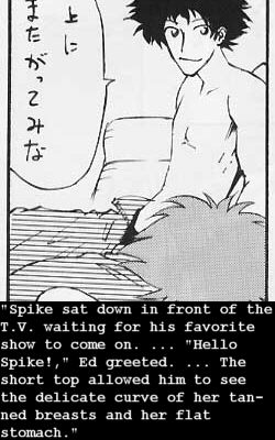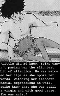 After oozing buttery smarm for a good half hour, Ed is overcome and subsequently dragged back to Spike's personal oil tank for a bloody good seeing-to. In a fantastically one-sided, mechanical “sex” scene that will make you weep, no lack of underwear goes unworn, no virgin sex goes unwetted, no hips fail to buck wildly at their respective ministrations, and no womanly essence goes uncorked. Any female orifice found holding back its “exotic juices” or “honey” forfeits its life within five hours.